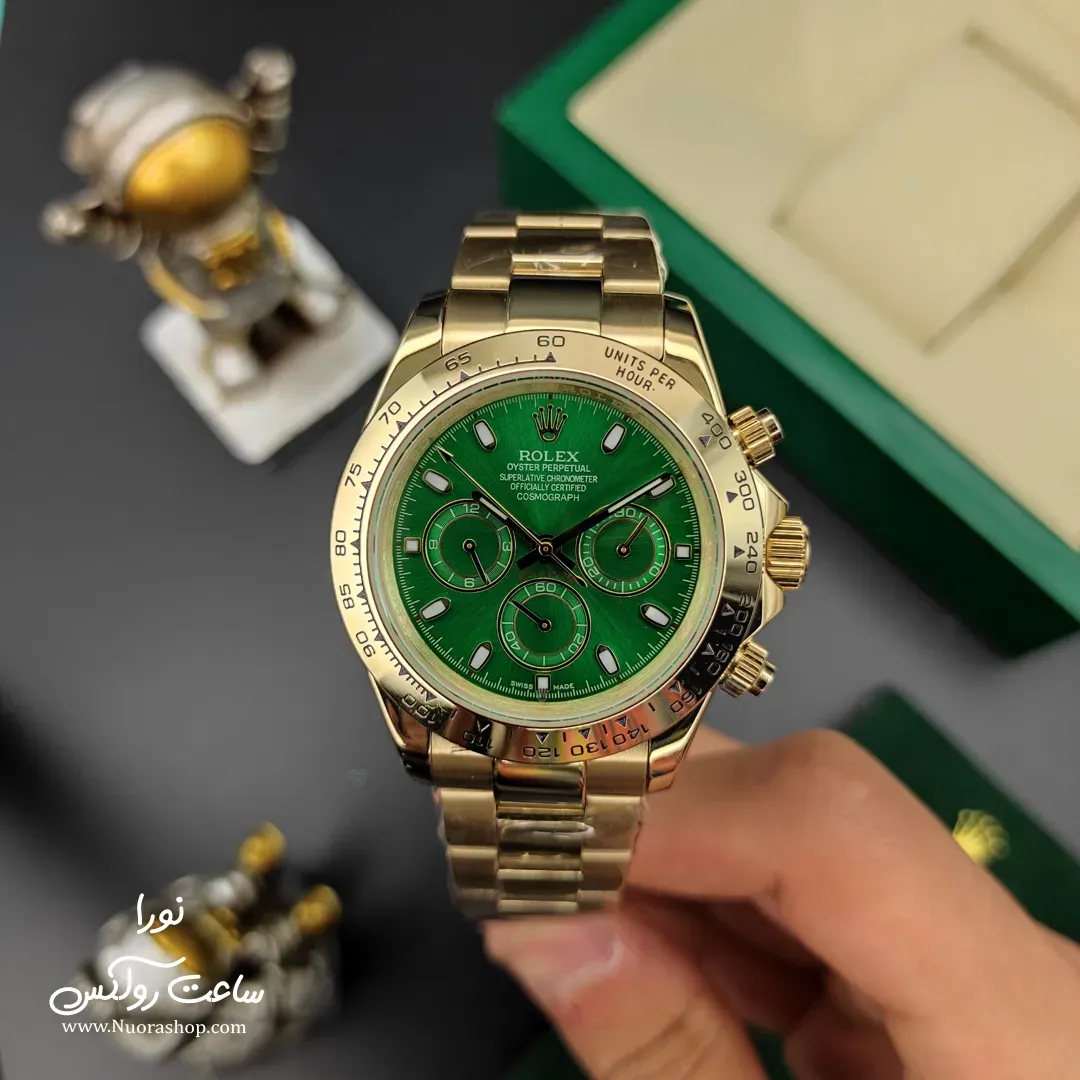 ساعت رولکس دیتونا طلایی صفحه سبز ROLEX DAYTONA GOLD GREEN dial یکی از جذاب ترین مدل های سری DAYTONA با صفحه سبز است که مورد توجه بسیاری از علاقه مندان ساعت مچی در جهان قرار گرفت. این مدل یکی از پر استفاده ترین مدل های ساعت افراد مشهور در جهان است . زلاتان ابراهیموویچ , نیمار و ارلینگ هالند تعدادی از افرادی هستند که این ساعت را برای استایل های خود انتخاب کردند. موتور به کار رفته در این ساعتمچی اتوماتیک بوده و دارای نزدیکترین جزئیات طراحی نسبت به نسخه اورجینال است. این مدل در دنیای ساعت مچی با نام john mayer شهرت دارد.