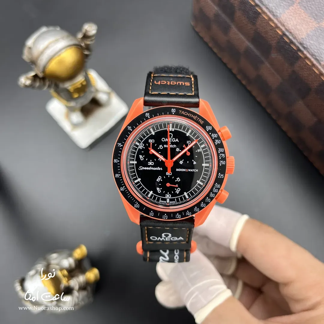 ساعت امگا و سواچ گدازه OMEGA X Swatch Mission on Earth LAVA جدیدترین مدل معرفی شده از لاین محصولات مشترک دو کمپانی معروف ساعت سازی امگا و سواچ است که در سال 2024 بعد از فروش و استقبال علاقمندان ساعت مچی به بازار عرضه شد طراحی این کالکشن که به نام Mission on Earth نامگذاری شده بر اساس وقایع طبیعی زمین ( شگفتی های زمین ) است. این طراحی که با ترکیب رنگی قرمز و مشکی به بازار معرفی شد الهام گرفته از رودخانه های گدازه آتشفشانی است. از ویژگی های این ساعت می توان به قابلیت کرنوگراف, 3 موتور فعال, بدنه بایو سرامیک, بند برزنت با کیفیت, قفل چسبی و قابلیت ضد آب اشاره کرد. در پشت قاب طرحی از سیاره زمین به چشم می خورد. رنگ بند این مدل جذاب مشکی بوده با قاب قرمز به فروش می رسد.
